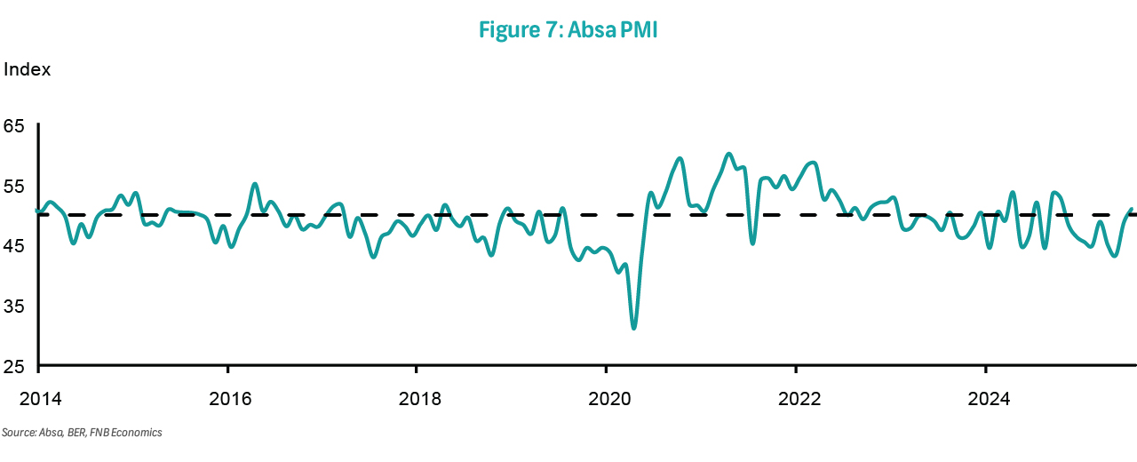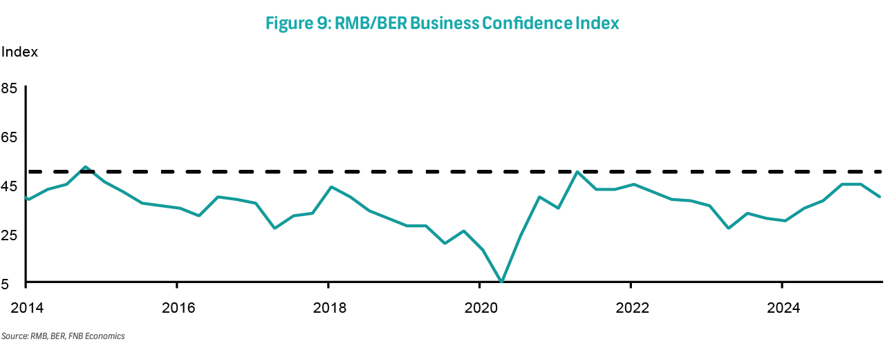 On Thursday, the RMB/BER Business Confidence Index (BCI) for 3Q25 will be published. In 2Q25, the BCI declined by five points to 40, signalling a pause in business sentiment recovery that began in 2Q24. Despite remaining above the 2023-2024 average, confidence dipped slightly below the long-term norm. The results were shaped by several external and domestic factors that prevailed at the time, including diplomatic tensions between the US and SA, global trade uncertainty, and persistent local logistical challenges.