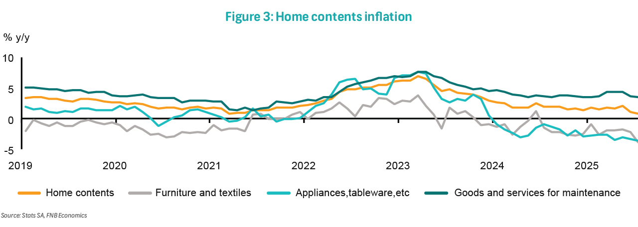 Meanwhile, there may be a post-pandemic overhang in home contents inflation. Alongside the supply-chain related post-pandemic surge in core goods inflation, pent-up home refurbishment demand that was driven by the work-from-home transition would have also supported inflation rising from 2.1% at the end of 2021 to 6.1% at the end of 2022 and a peak of 6.9% in early 2023. Base effects would have kept inflation muted before normalising this year. There appears to be a turn in the aggregate core goods inflation figure; however, home contents show further disinflation - and reflects deflation when excluding goods and services for routine household maintenance. Could this be indicative of developing structural trends? Are changing trade patterns and the likely lean to the East already driving inflation down in SA?