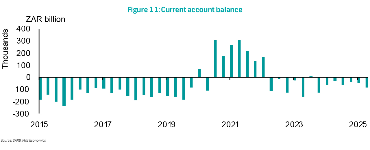 Current account data for 3Q25 will be released on Thursday. Last quarter, SA's current deficit widened to R82.8 billion, up from a R47.8 billion in 1Q25. As a percentage of GDP, the current account recorded -1.1% versus -0.6% in the previous quarter. This was largely driven by a narrower trade surplus on good and services. Elevated precious metal prices, alongside softer oil prices, continued to support the terms of trade.