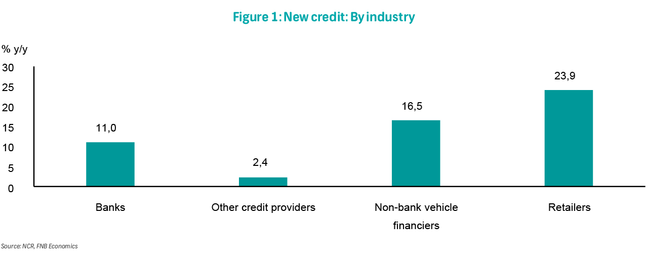 Banks remain dominant, issuing R122.7 billion (+11% y/y) and holding 78.6% market share. However, retailers posted the fastest growth, up 24% y/y to R12.2 billion, lifting their share to 7.8%. This reflects the rising popularity of in-store credit, driven by discretionary and durable goods purchases. Non-bank vehicle financiers also expanded significantly by 16.5% y/y to R11.5 billion, while other providers, including micro-lenders, grew modestly (+2.4% y/y) to R9.7 billion.