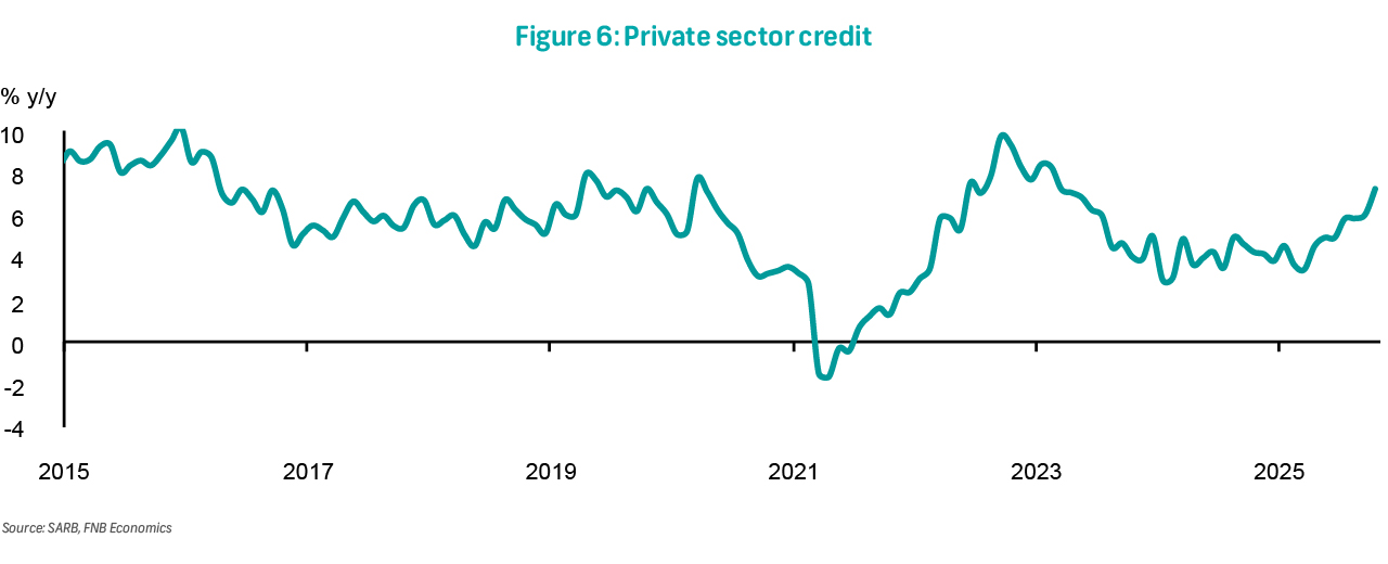 The market structure remains strongly shaped by asset-backed lending. Secured credit, primarily for cars and furniture, rose 16% y/y to R51.8 billion, holding the largest share at 33.2%. Mortgages increased 6.5% y/y to R48.6 billion (31.1%), supported by rising property prices and, to a lesser extent, a modest recovery in demand. Combined, these categories account for nearly two-thirds of all new lending.