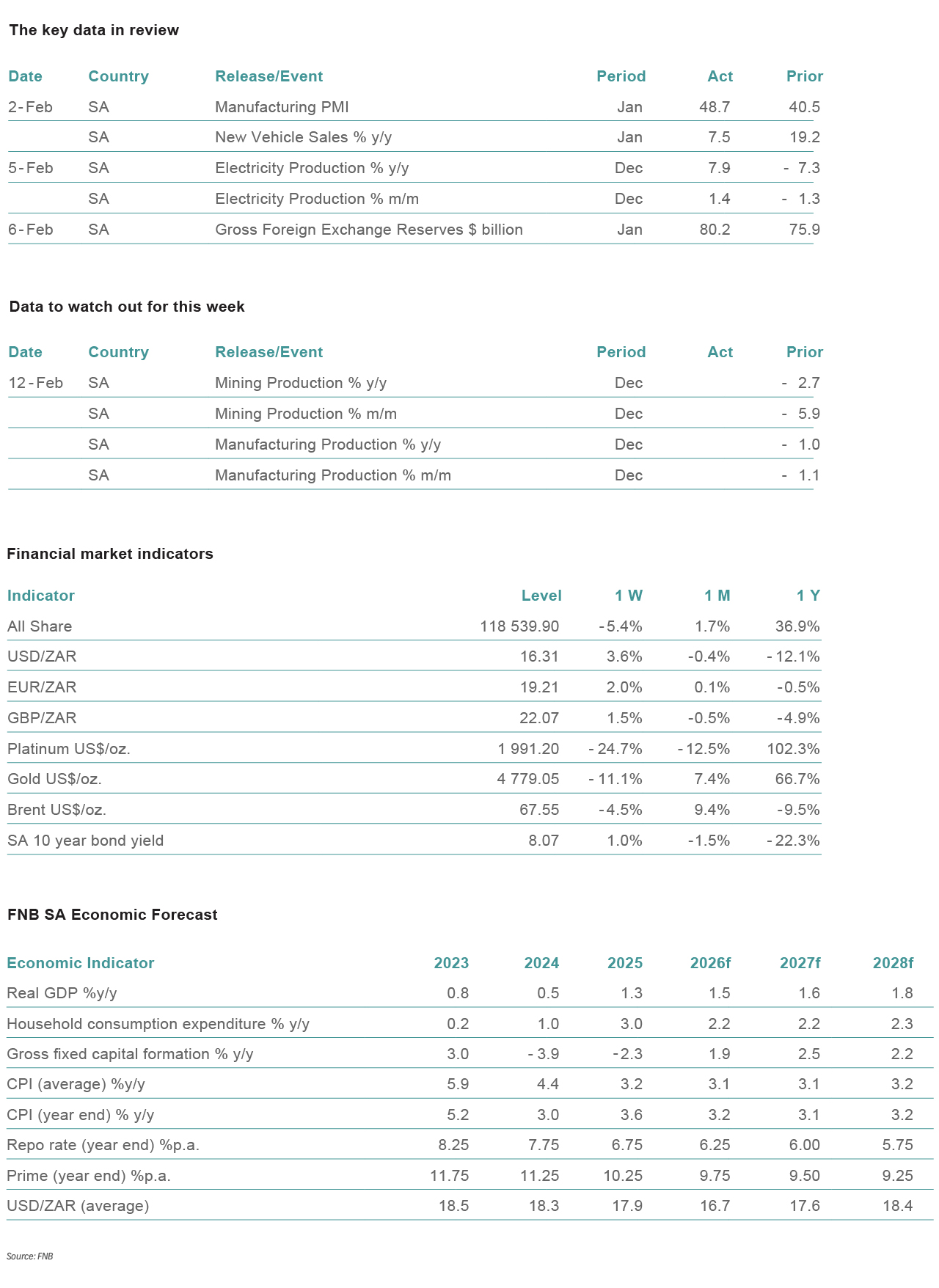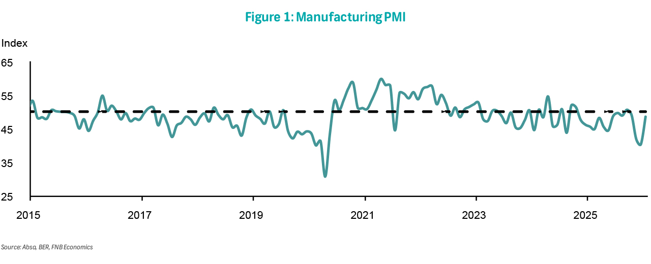 The manufacturing PMI increased by 8.2 points to 48.7 in January. All subcomponents improved relative to December, with business activity rebounding into expansionary territory, rising from 46.1 in December to 51.4 in January. The new sales orders index climbed by 10 points to 45.4 from 35.4 previously, driven mainly by stronger domestic demand. In contrast, export sales were negatively affected by the stronger rand. The inventories index returned to more normal levels in January following a sharp decline in December, providing support to the headline PMI. The employment index also improved, increasing to 43.9 from 39.9 as it recovered from its December downturn. The index tracking expected business conditions edged only slightly lower, from 68.8 to 66.4, but remains nearly 10 points above the 2025 average and still signalling expectations of a meaningful improvement in business conditions over the next six months. That said, the PMI has been volatile, and the manufacturing sector's performance is underwhelming. Ultimately, much needs to be done to improve South Africa's industrial base.