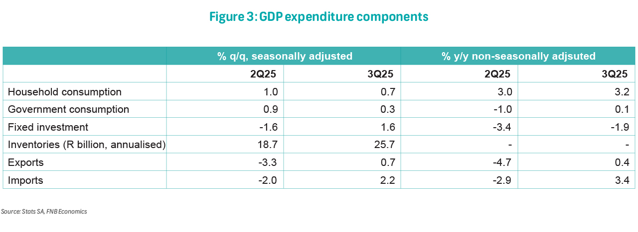 Gross capital formation rose 2.6% q/q, up from 2.3% q/q, driven by an increase in inventory accumulation to R25.7 billion from R18.7 billion (previously R16.6 billion, annualised). Gross fixed-capital formation (investment in long-term productive assets) increased by 1.6% q/q, rebounding from a 1.6% q/q contraction in 2Q25. This was supported by: