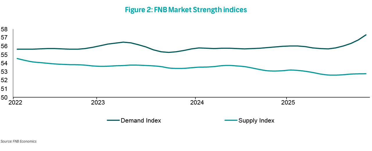 The FNB House Price Index (HPI) decelerated slightly to 4.7% y/y in November, down from a revised 5.0% in October (previously 4.9%) (Figure 1). Month-on-month growth has averaged 0.2% in the last three months, compared to 0.6% in the three months prior, signalling that the upward price trend is peaking. Nevertheless, our internal market strength indicators, particularly the demand index, spiked in November to the highest level in over 17 years (since June 2008) (Figure 2). While seasonality may be a factor, it could also be an early signal that the latest monetary policy developments, including the lowering of the inflation target and the subsequent interest rate cut, boosted market sentiment, prompting marginal buyers to bring forward their buying decisions.