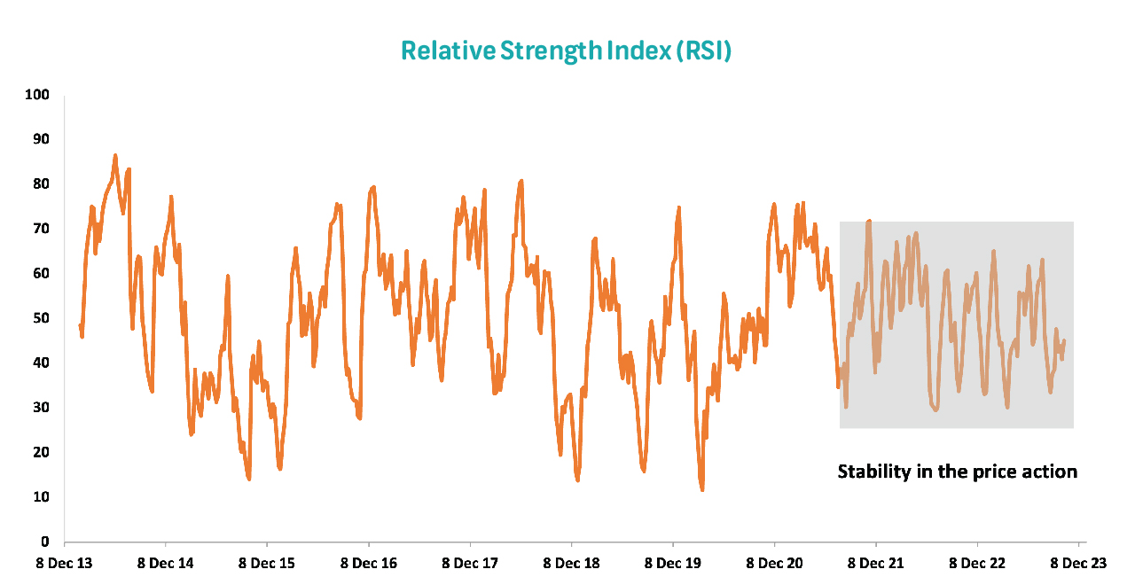 Technically, the stock is displaying price stability with regular upswings (see the shaded area on the first chart). Stability implies there is a consistent demand for the stock at its current price levels. This can be a sign that investors have confidence in the stock's value and its prospects. Regular upswings within stable price action can signal an uptrend.