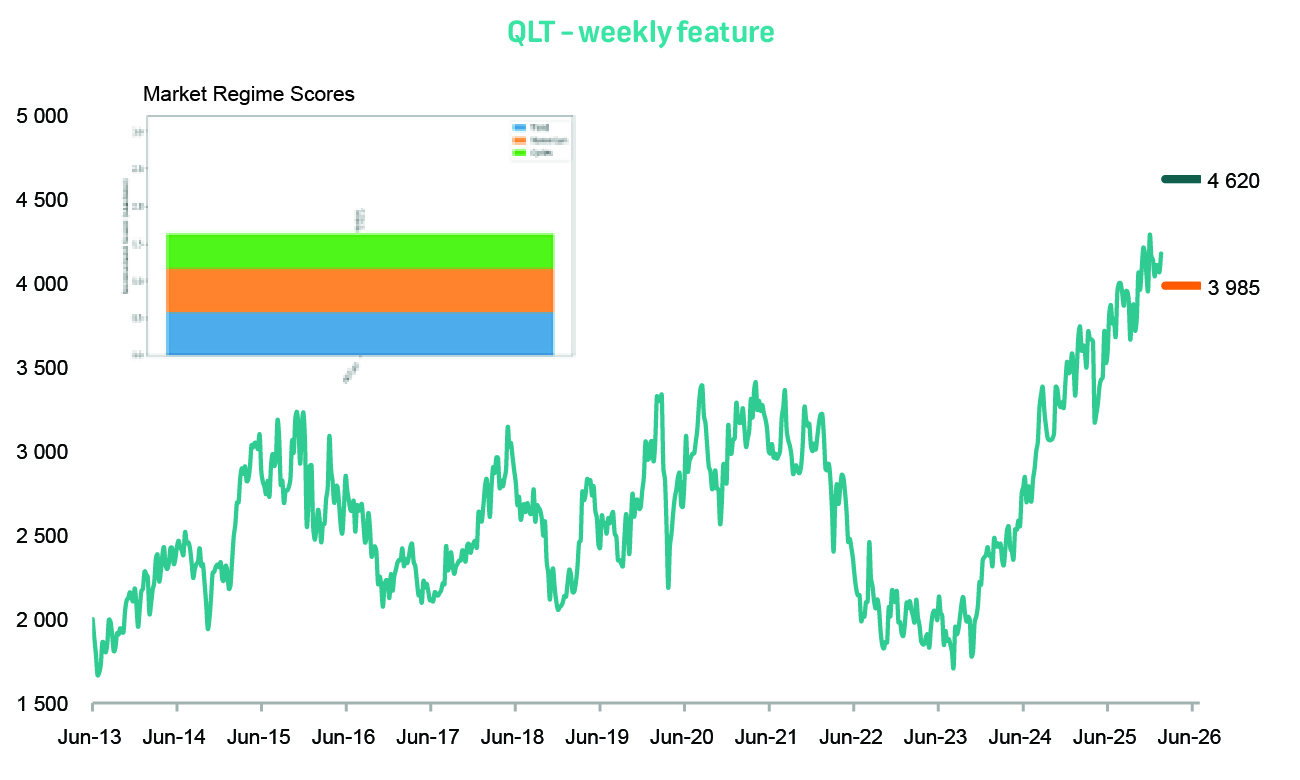 | Comment | An emerging Elliott Wave B recovery remains of interest. Although the price dipped below its 200-day simple moving average, fading downside momentum supports the trade. Our profit target remains R1 352.00, with an initial stop-loss at R1 038.00 and a trailing stop at R1 090.00. | A stable pattern of rising troughs and repeated upward impulses remains of interest, with the price holding above its 200-day simple moving average. However, fading upside momentum is a concern. Our profit target remains R42.00, with an initial stop-loss at R35.00 and a trailing stop at R37.60. | Price action near the lower boundary of an upward-sloping linear regression remains of interest, despite trading below the 200-day simple moving average. Muted downside momentum supports the trade. Our profit target remains R307.00, with an initial stop-loss at R262.00 and a trailing stop at R276.00. | Based on its historical tendency for strong follow-through after recovery years and an improving return profile into 2025, the outlook for continued upside in 2026 remains favourable. The price holds above its 200-day simple moving average, although fading upside momentum is a concern. Our profit target remains R110.00, with an initial stop-loss at R89.00 and a trailing stop at R97.50. |